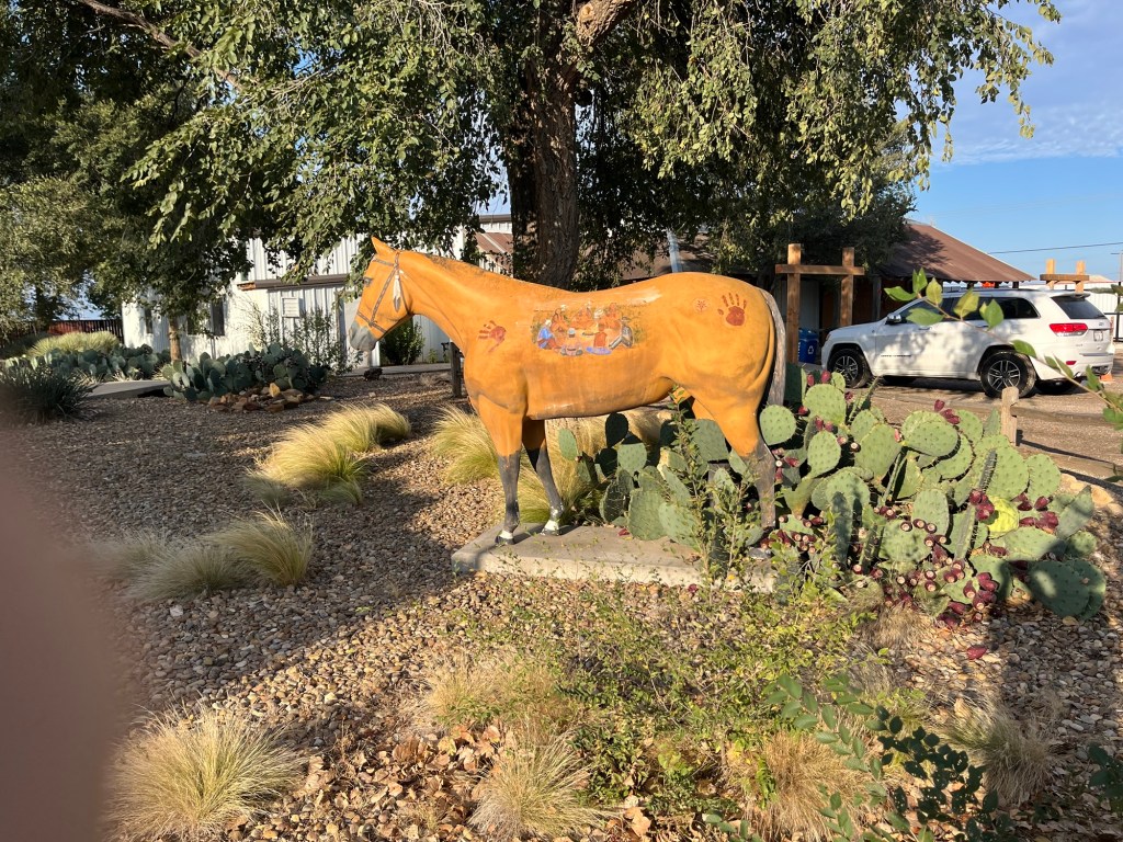 Since we are in Texas, I also see a fiberglass horse, 100s of American flags, and 1000’s of Texas flags. Just in case we forget where we are, every truck seems to be labeled with a Texas logo. I muse about why this happens so often in Texas compared to other states. I am so deep in thought that I almost step on a snake. It is dead, so I don’t have a heart attack.