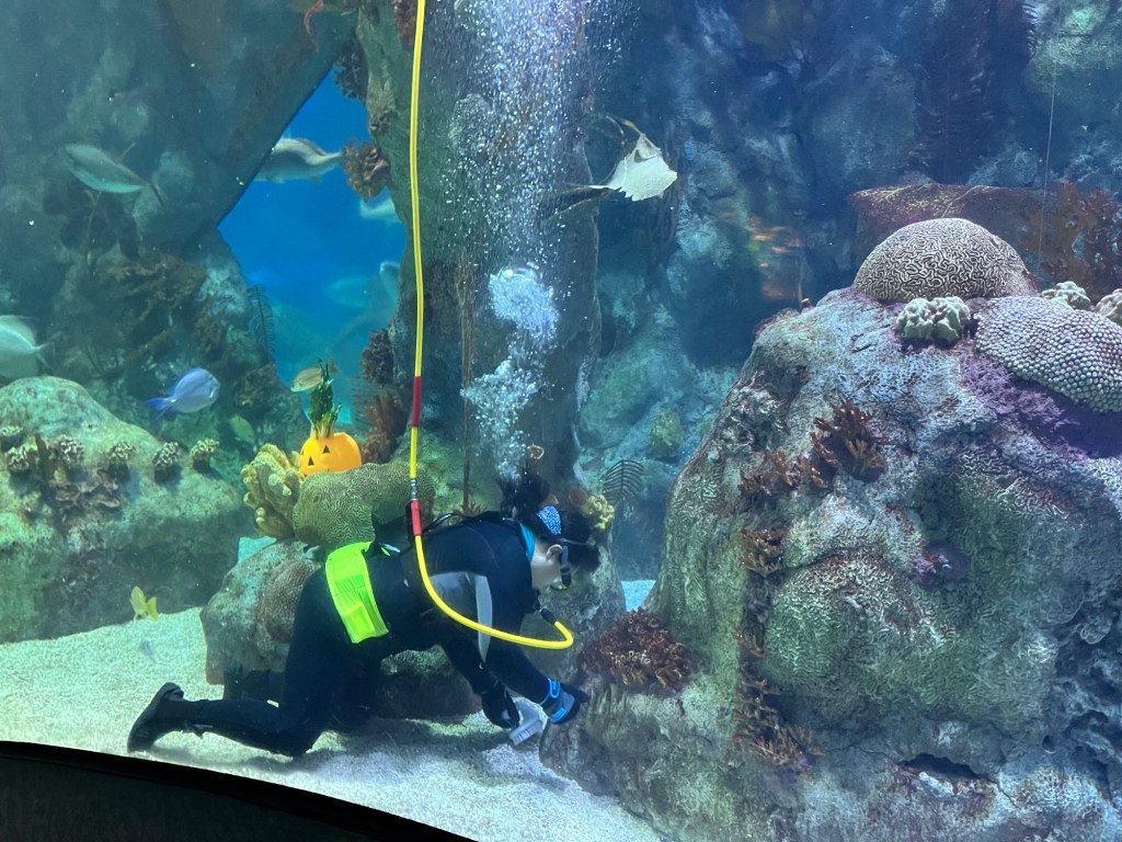 Because it is close to Halloween, the fish get enrichment toys of floating candles, pumpkins, and ghosts. The sea turtle is unimpressed. The eel seems relieved that he is already scary looking (no costume required).