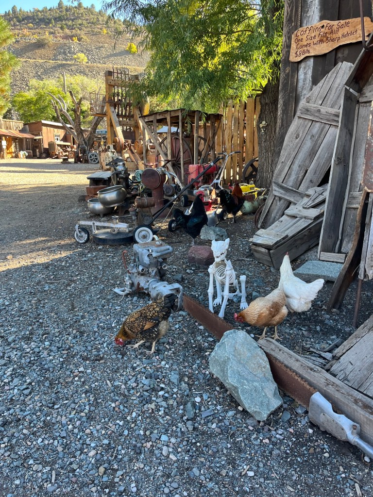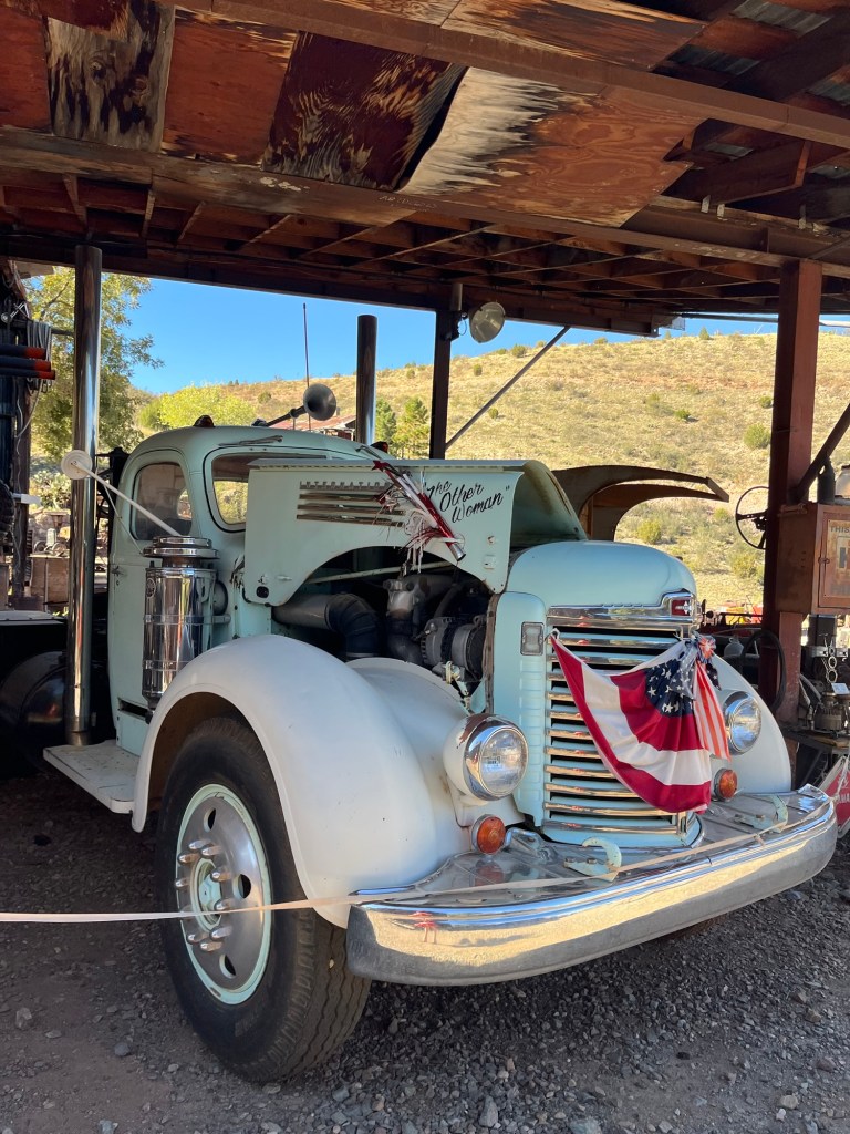After making as much lemonade as possible from this lemon of a stop we decide to go. We walk by their prize truck, festooned in patriotic bunting. I hope the shed doesn’t collapse on it. Or me for that matter. The gold king mine has turned out to be nothing but tarnished brass.