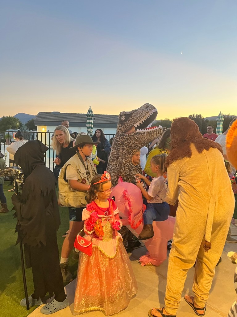 After dinner, the crowd walks across the park on a trick or treat parade. I am thankful I remembered to set out a bowl of treats at our sight. No need to rush.