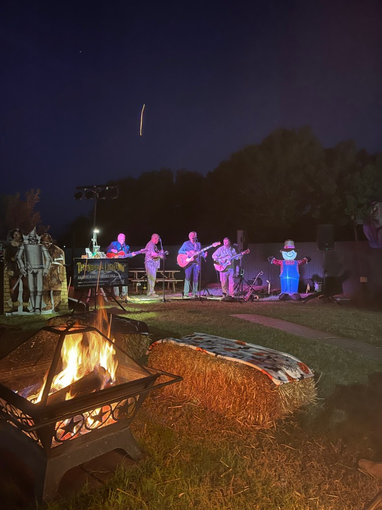 Campsites are elaborately decorated with lights, cut out figures, and blow up monsters. Everyone seems to be wearing a custom. My tiny witches hat, that I tucked in the rv on a whim, isn’t a blip on the radar. These folks are Halloween professionals.