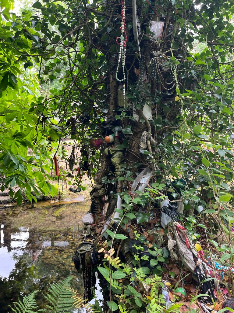 Stressed I walked across the street to the Holy Well. The Spring bubbled continuously. It was cool under the leaves. I was hyper aware of the tokens left to petition for health and good fortune. After several deep breaths, I rejoined the fray.