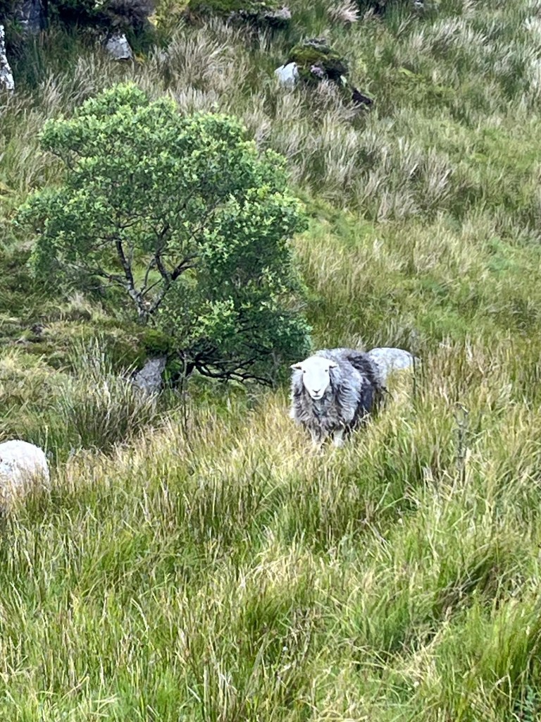 As we are resting, the sheep begin to move and the sky grows dark. A storm is coming. Suddenly, it seems important to get off the mountain with its exposed rock. I also don’t want to have to navigate the boardwalk in high winds and rain. My calves can’t take much more today.