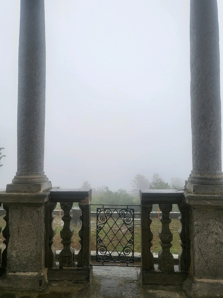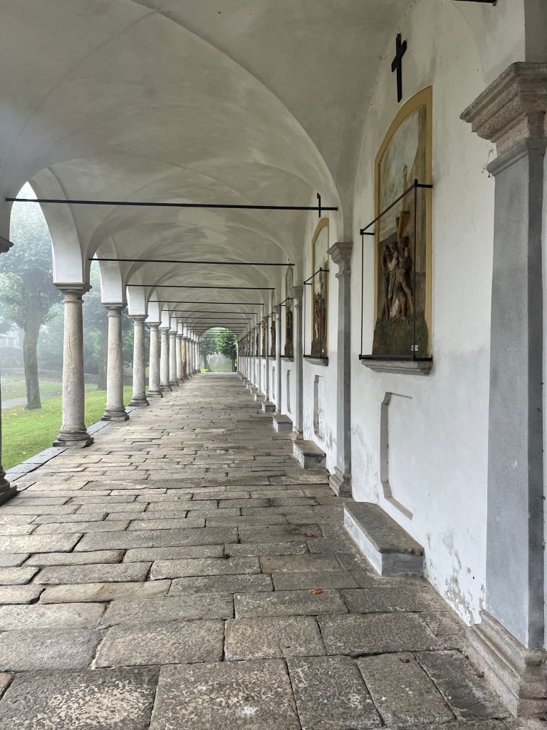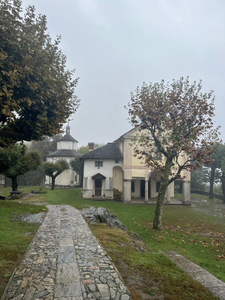 In an interesting landscaping choice, the walkways made a circle around the chapels, but did not actually lead to a chapel. To visit each area, you had to go off the path and through the water logged yard. It didn’t really matter. My feet couldn’t get any wetter. My pants, it turned out, could get a lot wetter. When I stepped on an unassuming flagstone tile, it tilted and created a plume of water that soaked my entire torso. Suddenly wet to my waist, I squished my way to chapel of Abraham…. At least there was a great view of Lake Maggiore from up here on the sacred mountain…..oh dense fog…. I still had a good imagination even if had temporarily misplaced my sense of humor.
