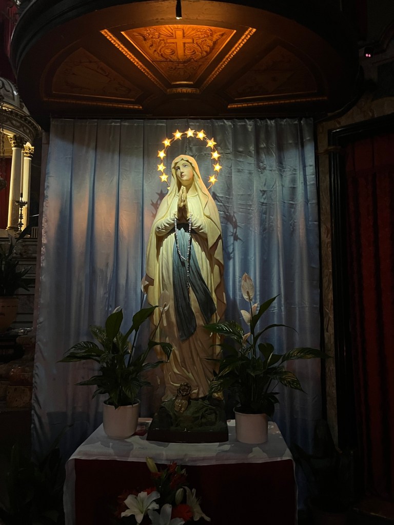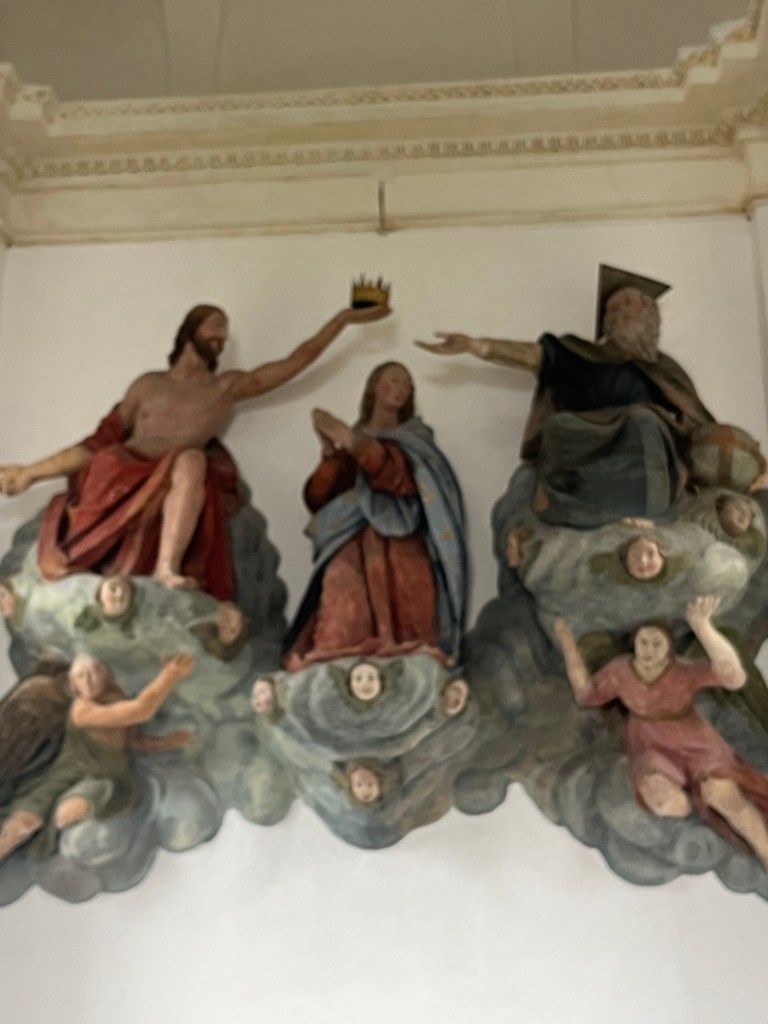 Steps lead downward to the crypt of the mother. This small chapel is adorned all in white. A wooden Madonna lies in a glass coffin. You can walk a circle around the coffin as you pray. People have tacked photos, baby bibs, and prayers throughout the chapel. I can’t tell if the artifacts are to pray for a successful birth or to mourn the loss of a child or both. It is clear this is an active pilgrimage site.