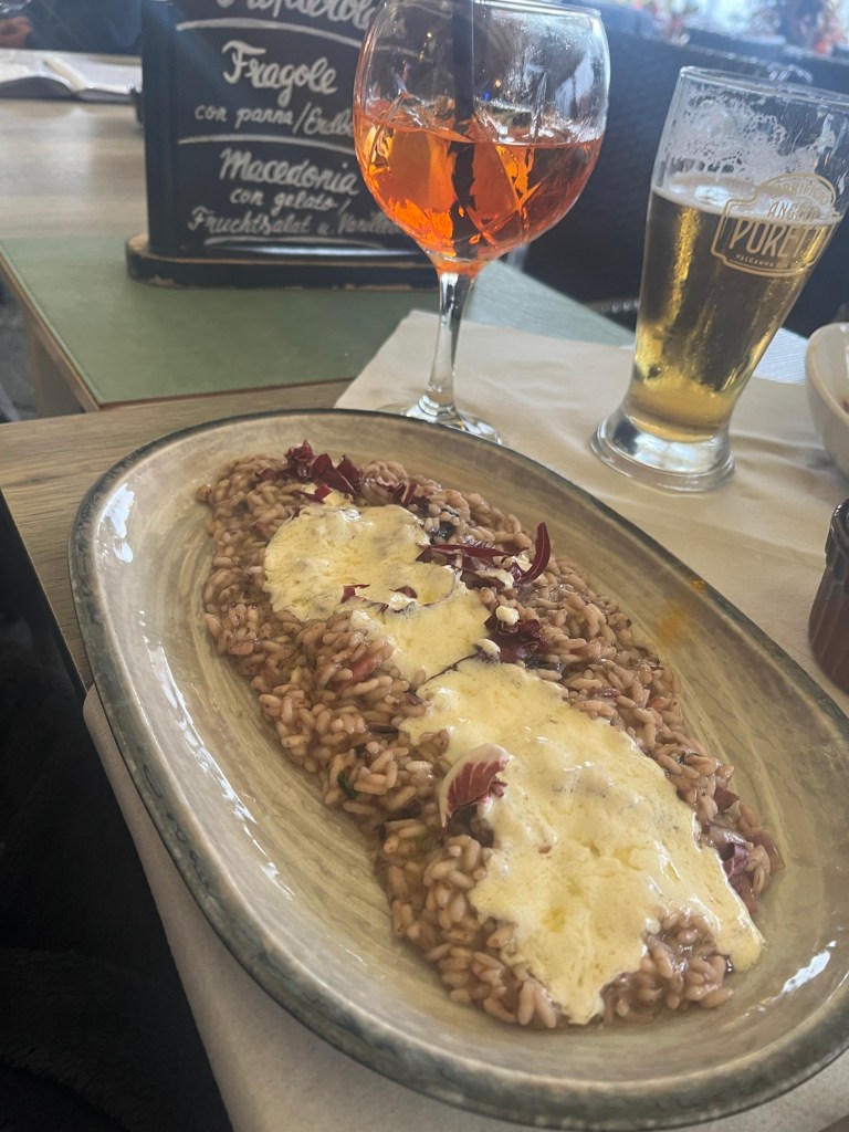 Before we knew it, it was time for lunch. We walked the row of restaurants along the pier and selected the “sport bar” solely because it had a large outdoor canopy with functional gas heaters and blankets. I wrapped up in a lap blanket, under a heater and attempted to dry. Meanwhile, the waiter brought appetizers of olives and bread. I took the plunge and tried the aperol spritz, a local favorite. It was light and fruity. I ordered the local risotto, loaded with fresh cheese. The risotto was definitely not light, but it was delicious.